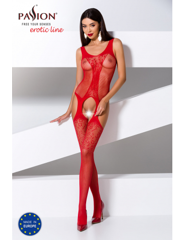 Combinaison en moyenne résille. Poitrine découverte et ouverture à l'entrejambe. Col ras de cou réhaussé de dentelle. Se noue à l'arrière. Le haut du dos est dégagé. Composition : 90% nylon, 10% spandex