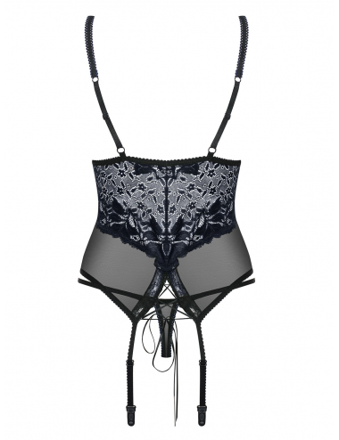 Découvrez cette magnifique guêpière de la collection 866 d'Obsessive. Au programme: de la dentelle fleurie d'un noir intense et d'un bleu foncé renversant, un laçage sexy à l'arrière, des coutures verticales qui soulignent magnifiquement la poitrine et un bijou brillant sur l'avant.*Le string assorti est inclus. Les bas ne sont pas inclus. Composition : 94% polyamide, 6% élasthanne