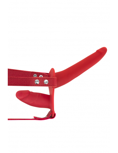 La ceinture de ce double gode rouge est en simili cuir pour atteindre une forme de fétichisme.