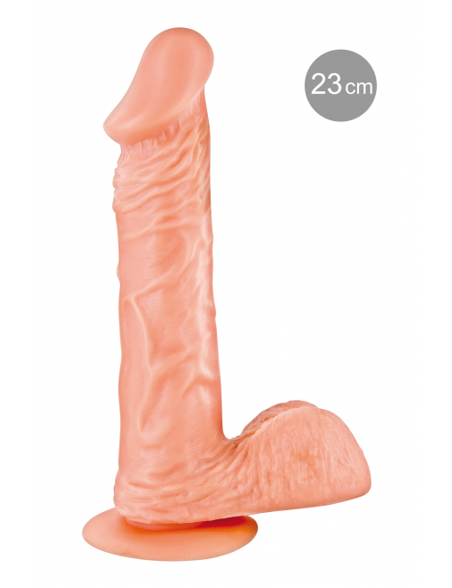 Ce gode réaliste avec ventouse et testicules est d'une longueur de 23cm et d'un diamètre de 4.2cm.