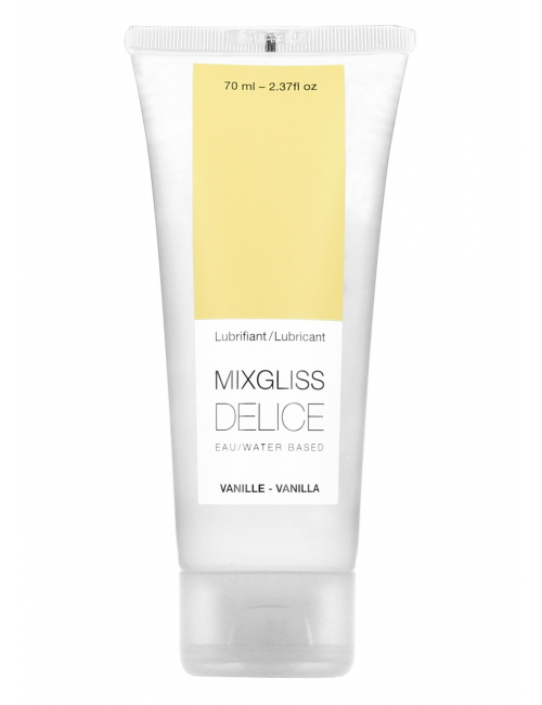 Mixgliss Délice est un lubrifiant intime à l'eau et à l?arôme naturel de vanille. Ce gel lubrifiant sensuel aux effluves sucrées et envoutantes est un vrai concentré d?exotisme.Son toucher onctueux vous offre des sensations enivrantes et un plaisir décuplé. Succombez à la gourmandise avec Mixgliss Délice.Ce lubrifiant intime vanille est d'une contenance de 70ml, il est compatible avec les préservatifs et les sextoys. SPÉCIFICATIONS TECHNIQUES? Parfum: arôme naturel de vanille? Ingrédients : aqua, propylene glycol,glycerin, hydroxyethylcellulose, fragrance,phenoxyethanol, benzyl benzoate,s o d i u m p o l y a c r y l a t e , a l l a n t o i n ,ethylhexylglycerin, aloe vera, benzylalcohol.? A noter: l?arôme naturel de vanillepeut causer une coloration naturellequi n?altère pas la qualité du produit? Usage intime; compatible avecpréservatif et sextoy. ? Précautions: en cas de contact avecles yeux, rincer à l?eau. En cas deréaction allergique, arrêter l?utilisation.Tenir à l?abri de la lumière & la chaleur. ? Fabriqué en France sous contrôlepharmaceutique? Contenance: 70 ml ? Pack: tube + capsule service + scellé? Lot + date de péremption: voir soudure ? Validité: 60 mois. ? Langues pack: FR, EN, AL, NL, ES, IT.