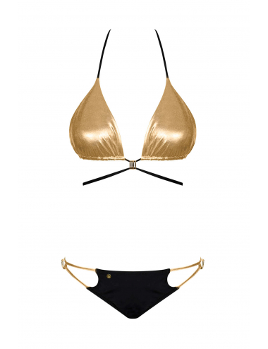 Ce maillot de bain 2 pièces dépareillé est avec une culotte noire assez ajourée sur les côtés avec élastiques dorés.