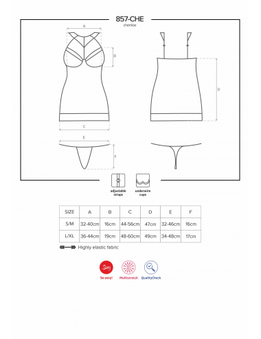 Incroyablement séduisante ! C'est ainsi que vous vous sentirez dans cette nuisette ultra-sexy de la collection Obsessive 857. Une maille fine, résistante et parfaitement élastique, une dentelle magnifique à motifs fantaisie, un design unique... tous les critères sont rassemblés pour dévoiler et sublimer votre corps. Vous n'avez plus qu'a l'essayer ! Bretelles ajustables pour un maintien parfait et un confort optimal. Composition : 94% polyamide, 6% élasthanne