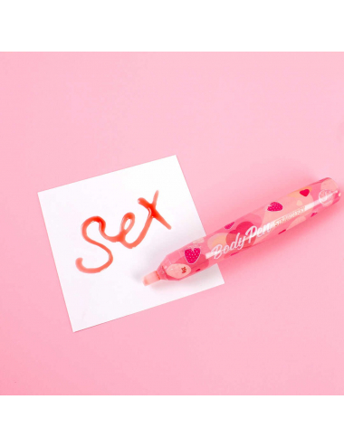Amusement sans limite avec ce "stylo" avec lequel vous pouvez dessiner sur la peau et ensuite lécher l'encre savoureuse. Parce qu'il n'y a que de la fraise! Vous pouvez dessiner sur le corps de votre partenaire ou sur votre corps. Mettez de l´óriginalité et du goût dans vos préliminaires avec ces stylos à l´éncre comestibles. Très amusant pour les couples. 100% cometible Saveur fraise 35g. Cruelty free / Non testé sur les animaux Référence : 6267 EAN : 8435097862675 Poids : 0,04 kg / 40 g Dimensions : 1,5 (Ø) (diamètre) x 14 (hauteur) Composition: Glucose, Saccharose, Glycérine, Eau, Sorbitol, Arôme, Acidifiant: E330, Colorant E124, Conservateur: E211. Mode d'emploi : Peindre sur la zone du corps souhaitée Précautions : Ne pas utiliser en cas d'hypersensibilité ou d'allergie à l'un des ingrédients. En cas d'irritation, cessez l'utilisation. Ne pas appliquer sur le contour des yeux ou sur les plaies. Tenir hors de portée des enfants. Conserver dans un endroit frais et sec et protéger de la lumière du soleil.
