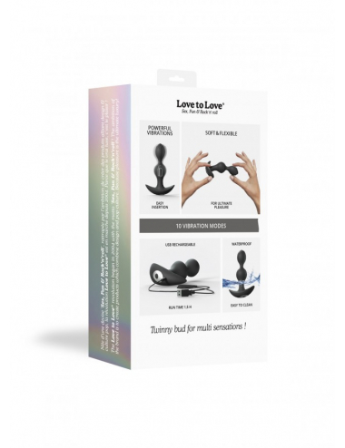 Douceur, sensualité et explosivité !Twinny Bud est le plug anal qu?il vous faut pour partir à la découverte de sensations insoupçonnées.Oubliez les plugs insipides, Twinny Bud offre une toute nouvelle façon de penser le plaisir anal.Sa recette orgasmique ? Deux perles qui caressent délicatement et qui vibrent en dix nuances d?intensité.Twinny Bud, c?est la promesse de sensations plus profondes, sans compromis. Pour elle, pour lui, pour rugir de plaisir, maintenant. CARACTERISTIQUE TECHNIQUESSilicone liquide + ABS1 moteur10 modes de vibrationsUSB rechargeable100% étancheTemps de charge : 2 h / Temps d?utilisation : 1,5 hLongueur insérable 10,2 cmDiamètre insérable : Ø 3,4 cmAVANTAGES Double stimulation des parois analesCourbe ergonomique pour une pénétration anale idéaleDoux et flexible pour une pénétration en douceurSilencieux CONSEILS D?UTILISATION Avant une première utilisation, chargez votre Twinny Bud pendant 2 heures.Pour plus de plaisir, appliquez une quantité généreuse de lubrifiant à base d?eau sur Twinny Bud avant et pendant l?utilisation.Twinny Bud est waterproof, vaporisez un nettoyant intime sur toute la surface puis rincez à l?eau clair avant de le laisser sécher.