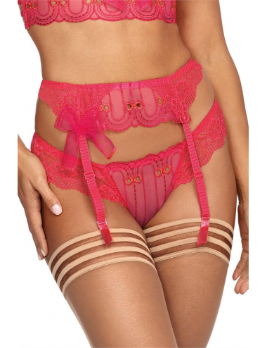 Ce porte-jarretelles est fait d'une fine maille rouge avec transparence et de dentelle noire.