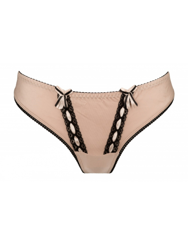 Un string beige doré à manger comme un bonbon d'ou son joli nom de Calisson et issu de la collection de luxe de la marque Axami "Charme de Provence". D'un tisse doux et lisse idéal pour les vêtements moulants, ce string sexy mettra parfaitement les fesses en valeur. Petite décoration noire et ruban satin. Sa composition est 78% Polyamide 20% Elasthanne 2% CotonAvec ce string Calisson, vous pouvez associer le soutien-gorge ou le tanga de la même collection.