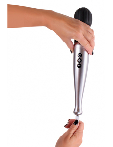 Un corps argenté et une terminaison noir pour cette version de luxe du vibromasseur wand.